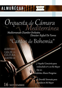 Vuelve la Orquesta de Cámara Mediterránea con el título "Cantos de Bohemia" y un programa que enamorará al público: "From my Life" de Smetana, "Concierto para violonchelo y orquesta nº 2 en Re Mayor de Haydn, y Serenata para cuerdas en Mi Mayor de Dvorák. Tres obras maravillosas interpretadas por unos músicos ya conocidos por su gran nivel interpretativo frente a los cuales estará el joven director, Rafael de Torres.